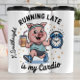 This humorous illustration features a cute, athletic pig in a blue workout outfit, holding a coffee cup and a ringing alarm clock. The pig has a cheerful, determined expression while running. The text at the top and bottom reads, "RUNNING LATE is my cardio," giving the art a very funny and relatable feel.