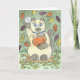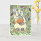 Inside verse: A sake toast to harvest time, This kitty makes it clear, Wishing you a lucky fall, And good fortune for all year. Artwork description on the back: A good luck wish for autumn. This lucky Siamese Maneki Neko is enjoying a relaxing sake break, with paw raised in a good luck toast amidst a flurry of colorful Autumn leaves. She is happily seated on her golden cushion and is holding a good fortune pumpkin for the occasion.