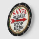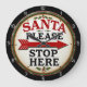This graphic illustration features a vintage-style, circular sign with the bold red text "SANTA PLEASE STOP HERE" and a large red arrow pointing to the right. The sign has a distressed look, with a green border and holly berry accents. The art has a rustic, nostalgic, and festive feel, making it perfect for a holiday door or yard sign.