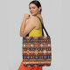 A seamless repeating pattern with geometric shapes and tribal motifs in warm orange, brown, and black colors tote bag