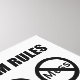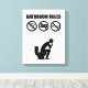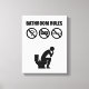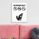 A set of bathroom rules with no wifi, no games and no mess icons and a silhouette person seating on a toilet.