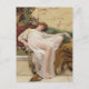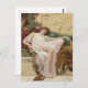 This postcard features artwork by John William Godward: "A Siesta" (1895). It depicts a sleeping young woman wearing a diaphanous gown, sprawled on a luxurious arrangement of furs, with a marble background. Relaxation, luxury, sensuality in Godward's classic realistic, highly detailed style.