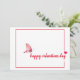 This is a postcard style greeting card. A simple design with type. A thin red border surrounds this script type, that reads "happy valentines day. There's a pink butterfly and a red heart for accents. Also there are ruled lines for the mailing address. If you don't want to use this as a postcard, you can remove the ruled lines and use this card with an envelope.
