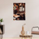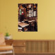 Inside a small cafe, table and chairs and decoration on the wall. This is a AI generated art.