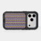 A smartphone case with a bold striped pattern in purple, white, and yellow hues. The design appears vertically in one view and horizontally in another. The case has a rugged black border, suggesting durability.