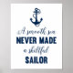 "A smooth sea never made a skillful sailor", inspirational quote art in navy blue and white.