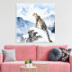 A pretty wildlife wall art with an illustration of a majestic snow leopard perched on a craggy, snow-covered peak, gazing out at a vast, frozen mountain range.
