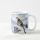 A pretty wildlife coffee mug with an illustration of a majestic snow leopard perched on a craggy, snow-covered peak, gazing out at a vast, frozen mountain range.