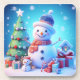 A cheerful snowman takes center stage in this vibrant Christmas scene. He's bundled up in a red and white scarf and topped with a fuzzy blue hat. His carrot nose and coal smile radiate warmth. He stands proudly beside a beautifully decorated Christmas tree, surrounded by colorful presents adorned with bows and ribbons. A miniature snowman with a Santa hat sits nearby, adding to the festive atmosphere. A charming snow-covered house with glowing windows peeks out from behind the gifts, completing the picture of holiday magic. The backdrop of a twinkling blue sky and falling snowflakes enhances the overall enchantment.