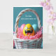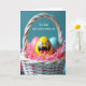 This design shows a white woven basket under soft light, filled with coral-pink shredded filler and several smooth pastel eggs in light pink and pale blue. In the front sits a sun-yellow egg with a cartoon-like face—furrowed brows, wide eyes, and a toothy grin with small fangs and a red tongue—leaning forward as if showing off to its calmer neighbors 🐰. The gentle pastel eggs behind it look like quiet companions, making the yellow one feel like the mischievous friend who steals a teasing glance and gets away with it. Across the upper area, the message reads “To A Son WHO ALWAYS STANDS OUT,” with “To A Son” in smaller lettering and “WHO ALWAYS STANDS OUT” larger, all in white text. The words sit near the top and are partly softened where the basket handle arches in front, as if the handle is lightly veiling the message. A rich turquoise-blue background surrounds the basket, giving strong contrast to the yellow and pink tones 🌷. The basket’s curved handle frames the top of the scene, while the foreground egg stays sharp against the slightly blurred eggs behind it.