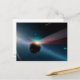 Artist's conception of a storm of comets in the Eta Corvi system, with a possible planet. One such giant comet is shown smashing into a rocky planet, flinging ice- and carbon-rich dust into space, while also smashing water and organics into the surface of the planet. A glowing red flash captures the moment of impact on the planet. Yellow-white Eta Corvi is shown to the left, with still more comets streaming toward it.