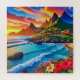 A vibrant coastline stretches alongside lush green mountains, under a colorful sunset sky. Waves gently crash onto the sandy beach, while a small village sits nestled between the hills and the ocean.