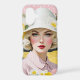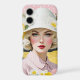A stylish vintage-inspired portrait on a pink floral phone case featuring a glamorous blonde woman in a hat, with pink cheeks and red lips. Elegant and artistic design for fashion lovers.