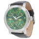 A stylish wristwatch with a round face featuring a vibrant green and yellow tropical leaf design. It has a silver case and a black leather strap.