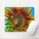 A mouse pad designed using a macro photo of a big and beautiful sunflower against a blue sky background. Photo shows all of the intricate details of a sunflower bloom with bright vivid colors.
