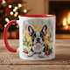 An adorable Boston Terrier dog sitting in illuminated Christmas lights seasonal festive coffee mug.