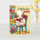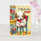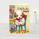 This card shows an adorable young, human-like puppy with fluffy white-and-brown fur and big dark eyes, sitting on a teal armchair with a red cushion and a gentle, focused expression that feels lovingly directed toward someone special ❤️. Wearing a simple red shirt, the character holds a yellow pencil over a cream note on their lap, as if carefully choosing the right words for Mom. The message “To Mom” appears on the note in dark lettering, centered and easy to spot against the pale paper. Soft, diffused light warms the room, giving the scene a cozy, caring mood like a quiet moment shared in a familiar home. On a golden-yellow tabletop nearby, a teal vase holds red roses, and a small gift box sits close by, suggesting a sweet, thoughtful surprise 🌼. A red basket filled with golden treats adds a comforting touch, while a teal bin with a red rim holds crumpled white pages that hint at a few earnest drafts. Red rose petals are scattered across the floor, echoing the bouquet, and the background includes diagonal stripes in red, yellow, and teal.