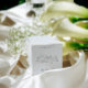 A refined black and white wedding favor box featuring graceful calligraphy paired with a timeless serif font.