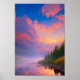 This digital artwork captures the serene beauty of a majestic sunset over a calm river passing by the forest. The setting sun is hidden behind the clouds, creating a stunning array of purple and pink hues that fill the sky. The tranquil waters of the river and the lush greenery of the forest create a peaceful and idyllic setting. This artwork captures the essence of the beauty and serenity of nature.