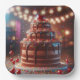 A decadent three-tiered chocolate cake takes center stage, its rich layers adorned with cascading chocolate ganache and a vibrant scattering of colorful sprinkles. Each tier is crowned with plump, juicy cherries, and a single, perfect cherry reigns supreme at the very top. The warm, inviting glow of fairy lights in the background creates a festive atmosphere, hinting at a joyous celebration. The scene is a feast for the eyes, promising a delightful explosion of flavor with every bite.