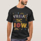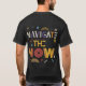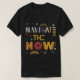 A t-shirt design with the text "Navigate the Now." in bold, geometric letters, set against a backdrop of colorful shapes and lines.