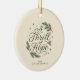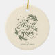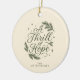 A modern Religious Christmas tree ornament with A Thrill of Hope in whimsical lettering in dark green. On the reverse is a pattern of green and navy holly and pine leaves. Personalize with your family name.