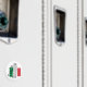 Italian flag, line drawing of the leaning tower and the word "Italia"