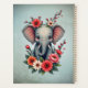A touch of summer: The baby elephant in a sea of flowers. This enchanting design features a loving illustration of a small baby elephant, painted in delicate shades of gray. Its pink inner ears add a playful and charming touch. Its large, expressive eyes radiate curiosity and friendliness, while its sweet facial expression conveys pure warmth. The elephant sits gently enthroned among a variety of colorful flowers in vibrant shades of red, orange, pink, and white.