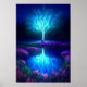 Under the veil of night, behold the charm of a solitary tree standing by the pond. Bathed in ethereal blue light, its reflection dances upon the tranquil waters. A scene of serenity and mystique unfolds, captivating your senses as the night whispers its secrets.