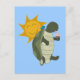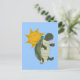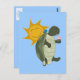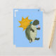 A turtle enjoys an ice cream cone on a warm day in the mixed media image on this postcard. The green tortoise sits upright with legs outstretched. He holds a waffle cone filled with ice cream covered in colorful sprinkles. The smile on his face as he licks the frozen treat shows his satisfaction. A blue butterfly has lit on his shell and a smiling sun shines down on both of them. From my original digitally created image.