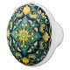 The ceramic knob is a captivating work of artistry. Its dark blue background serves as a striking canvas, providing a dramatic contrast to the vivid yellow and green floral symmetrical motif. The deep, rich hue of the blue evokes a sense of mystery and depth, creating a visually compelling foundation for the intricate design.