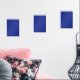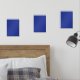 A vibrant blue backdrop with a clean white square wall art sets