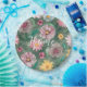 A vibrant floral pattern set against a green background. The flowers are painted in a mix of colors, including pink, yellow, and white, with intricate details like petal edges and flower centers. There are also green leaves scattered throughout, complementing the flowers. The overall design gives a fresh and lively feel, reminiscent of spring or summer.