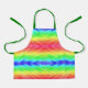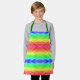 A vibrant, rainbow-patterned apron with green straps displayed on a white background. Below, a smiling child wears the apron over a gray shirt. Bright, cheerful mood.
