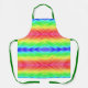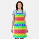 A vibrant, rainbow-patterned apron with green straps displayed on its own and worn by a person over a light blue shirt, conveying a cheerful, lively tone.