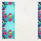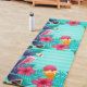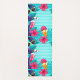 A vibrant yoga mat features a playful tropical design with colorful ice cream cones, refreshing drinks, and bright pink hibiscus flowers. The background is a soothing aqua with subtle stripes, enhancing the lively elements.