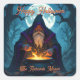 A warlock in black and purple brewing up the ingredients for a perfect Halloween party under a full moon.