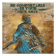This detailed abstract graphic design features an African American black male warrior in battle holding his two swords in a fantasy concept, rendered with precision and skill partly made with AI technology. Accompanying the design is an encouraging quote: "BE COMFORTABLE IN YOUR OWN SKIN".