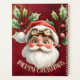 A whimsical steampunk Santa Claus against a deep red background adorned with holly leaves and berries. Santa wears a red hat with white trim and a pair of steampunk-style goggles with golden accents. His white beard and rosy cheeks add to his jolly appearance. The words "MERRY CHRISTMAS" are written in a decorative font at the bottom of the image.