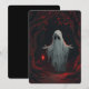 The overall color palette is dark and moody, dominated by blacks, reds, and whites. The illustration employs a detailed, semi-realistic style with a focus on texture and depth, creating a haunting and immersive scene. The ghost's lantern is the only bright source of light, highlighting the eerie, mystical environment.