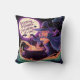 A witch mixes a bubbling potion in her cauldron, illuminated by a glowing full moon, with a curious cat observing from the shadows.