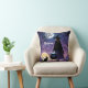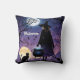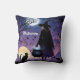 A mysterious witch stirs a bubbling cauldron as bats fly around, with a black cat by her side, all illuminated by the enchanting glow of a full moon.