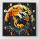 A witch gallops through a dark landscape, illuminated by the orange glow of a full moon, surrounded by bats, pumpkins, and a haunted castle in the distance.