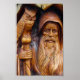 A wise old wizard, witch or warlock with a wavy beard and wearing flowing robes stands in a cave entrance with his sceptre or staph and an owl on his shoulder. Color photo of finely detailed, artwork carved in wood.