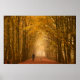 Poster print of a woman taking a walk with her dog through the morning fog on a path in a beech tree forest in autumn colors.