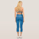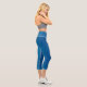 A woman's torso and legs in blue capri leggings with a spotted pattern. She is standing against a neutral background, conveying a casual and active tone.