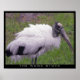 A Wood Stork fluffs his feathers. - The original photograph by ZoeSPEAK on this poster shows a wood stork fluffing his feathers. This unusual looking wild bird has white plumage over black wing feathers, long thin legs and a long brown beak that tapers from the head to the curved tip. The stork's neck is covered in small grayish feathers with a black band at the crown. and the rest of the head looks almost featherless. The stork, an endangered species, is showing us his photo profile, looking at us with one black eye. There is a black border frame around the photo, with the words THE WOOD STORK in a light beige color. centered under the picture.