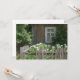 A photograph showing a wooden rural hut with a window and a garden full of white roses.