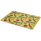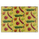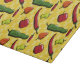 A peri-peri, friggitello, habanero, rocoto, jwala, and shishito chili pepper are decorated with patterns from the region where they were originally cultivated or are commonly eaten and sit on a yellow background with patterns inspired by tattoos worn by native peoples in the Amazon to create a fun repeating pattern that reflects the origins and spread of these tasty, and often spicy fruits.