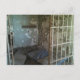 A blue floor mat lies in an abandoned holding cell in an abandoned prison.